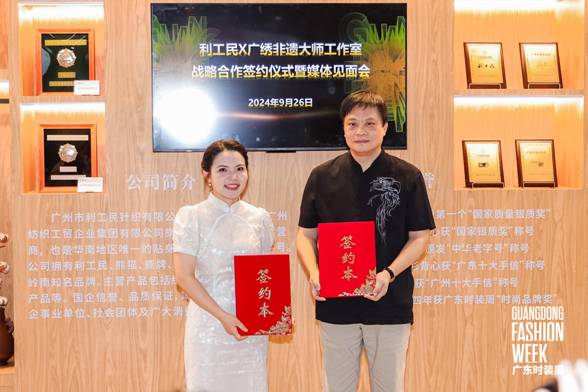 9月26日上午,百年中華老字號利工民與廣繡非遺大師工作室在2024廣東時裝周-秋季舉辦戰(zhàn)略合作簽約儀式暨媒體見面會?;顒佑蓮V東省服裝服飾行業(yè)協(xié)會副會長兼秘書長陳韶通主持,邀請了廣東省服裝服飾行業(yè)協(xié)會、廣東省服裝設計師協(xié)會、廣州紡織工貿(mào)企業(yè)集團有限公司、服裝行業(yè)企業(yè)代表和媒體代表等嘉賓出席共同見證本次活動。