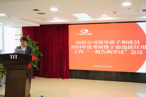 2月18日下午,紡織公司黨委召開領(lǐng)導(dǎo)班子和成員2024年度述職暨干部選拔任用工作“一報(bào)告兩評議”會(huì)議。會(huì)議由公司黨委副書記、工會(huì)主席丘海瀾主持。紡織公司領(lǐng)導(dǎo)班子成員、中層管理干部、公司“一代表兩委員”以及黨員干部群眾代表參加了會(huì)議,廣州輕工集團(tuán)紀(jì)檢監(jiān)察室派員出席了會(huì)議。