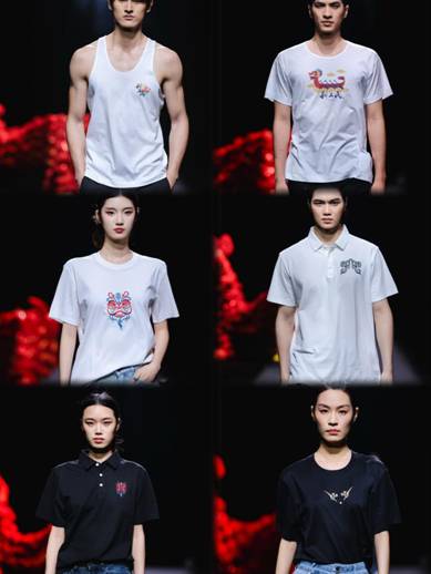 一是非遺技藝與現(xiàn)代設(shè)計(jì)交相輝映。本次時(shí)尚之夜以“時(shí)尚灣區(qū)•非遺新造”為主題,匯聚了粵港澳三地22個非遺服裝品牌。其中,利工民的展演作品尤為亮眼——品牌巧妙融合國家級非遺“粵繡(廣繡)”的細(xì)膩針法與區(qū)級非遺“利工民汗衫背心制作技藝”的經(jīng)典工藝,打造出系列“非遺潮T”。走秀環(huán)節(jié)中,模特身著的這些汗衫背心看似簡約,實(shí)則暗藏巧思:胸前精致的青銅紋樣與醒獅圖案,是廣繡技藝與百年汗衫工藝的完美對話;特別是“饕餮紋”的黑色背心,古老紋樣經(jīng)現(xiàn)代設(shè)計(jì)煥變?yōu)槌笨釄D騰,生動詮釋了傳統(tǒng)技藝在當(dāng)代服飾中的創(chuàng)新表達(dá)。