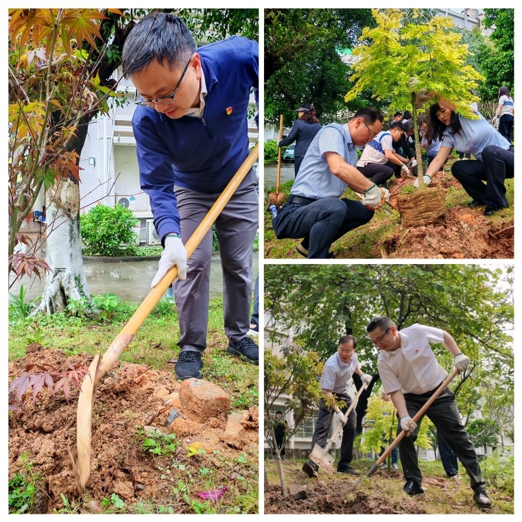 活動現(xiàn)場,大家分工明確、干勁十足、協(xié)作高效,有條不紊的分成植綠小分隊:大家奮力揮鏟挖坑,確保樹苗根系舒展空間足夠大,扶苗定直、揮鍬填土,配合默契,并接力澆水,采用“少量多次”法保障土壤滲透均勻,并逐一檢查樹苗垂直度、填土緊實度,確?!霸砸豢?、長一棵”。經(jīng)過大家“愛綠”勞作,20棵楓葉樹苗迎風挺立,為園區(qū)增添了綠色盎然生機。