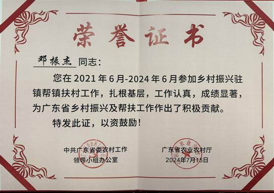 鄧振杰同志獲中共廣東省委農(nóng)村工作領(lǐng)導(dǎo)小組辦公室、廣東省農(nóng)業(yè)農(nóng)村廳表揚(yáng)